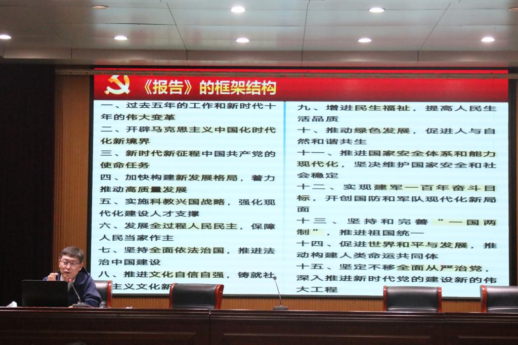 會(huì)上,黨委書記秦昌盛介紹了黨的二十大的概況,對(duì)黨的二十大報(bào)告的框架結(jié)構(gòu)及主要內(nèi)容進(jìn)行了領(lǐng)學(xué),并對(duì)學(xué)院未來學(xué)習(xí)黨的二十大精神的工作進(jìn)行部署安排,從活動(dòng)階段、活動(dòng)主題、主要內(nèi)容、時(shí)間等方面對(duì)2022年度“學(xué)習(xí)宣傳貫徹黨的二十大精神”周工作推進(jìn)表進(jìn)行了詳細(xì)講解。