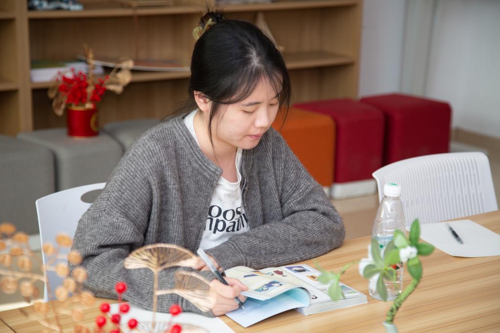 活動中,同學們在現場挑選自己感興趣的心理書籍進行閱讀,如《天才在左瘋子在右》、《大五人格心理學》等,伴隨著輕柔的舒緩音樂,同學們沉浸在書海中,享受閱讀帶來的放松和愉悅。同時,現場工作人員為參與者分發紙張、畫筆、貼紙等材料,讓同學們在閱讀的過程中,隨心隨意制作屬于自己的閱讀手賬,將書中有趣的段落、自己的感悟寫到紙張上,體驗閱讀與制作的樂趣,記錄這一刻的美好。